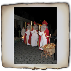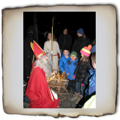 Nach einer kurzen Begrüssung in der Kirche begeben wir uns gemeinsam zum Schulhaus, wo allen Kindern ein Geschenk überreicht wird.